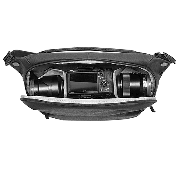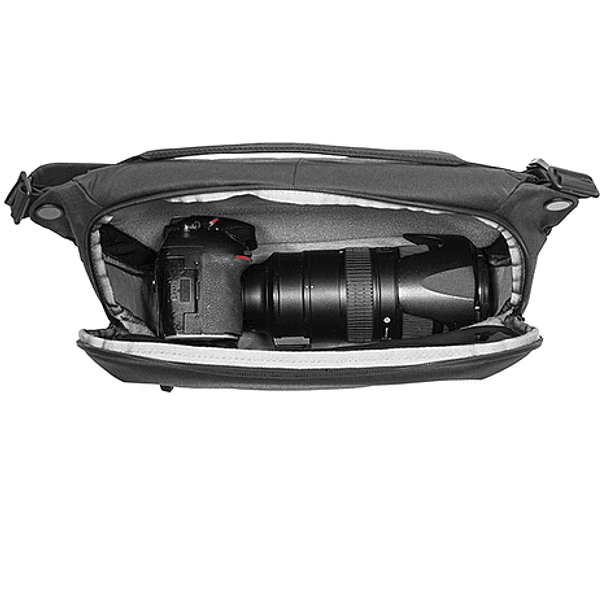 El Everyday Sling v2 10L de Peak Design es una opción de transporte compacto y versátil que se puede usar alrededor de la cintura o como un bolso normal, adaptable al hombro derecho o izquierdo. Está diseñado para ajustarse cómodamente contra el cuerpo, la apertura con cierre permite acceder fácilmente al compartimento principal, que incluye un divisor que se puede configurar de acuerdo al equipo específico que se transporta. El divisor es plegable y puede acoplar superficies curvas como el agarre de una cámara con una lente incorporado. Durante el uso, el divisor plegable mejora la protección entre esas superficies curvas y elementos adyacentes al tiempo que minimiza el área entre ellas para un uso más eficiente del espacio.